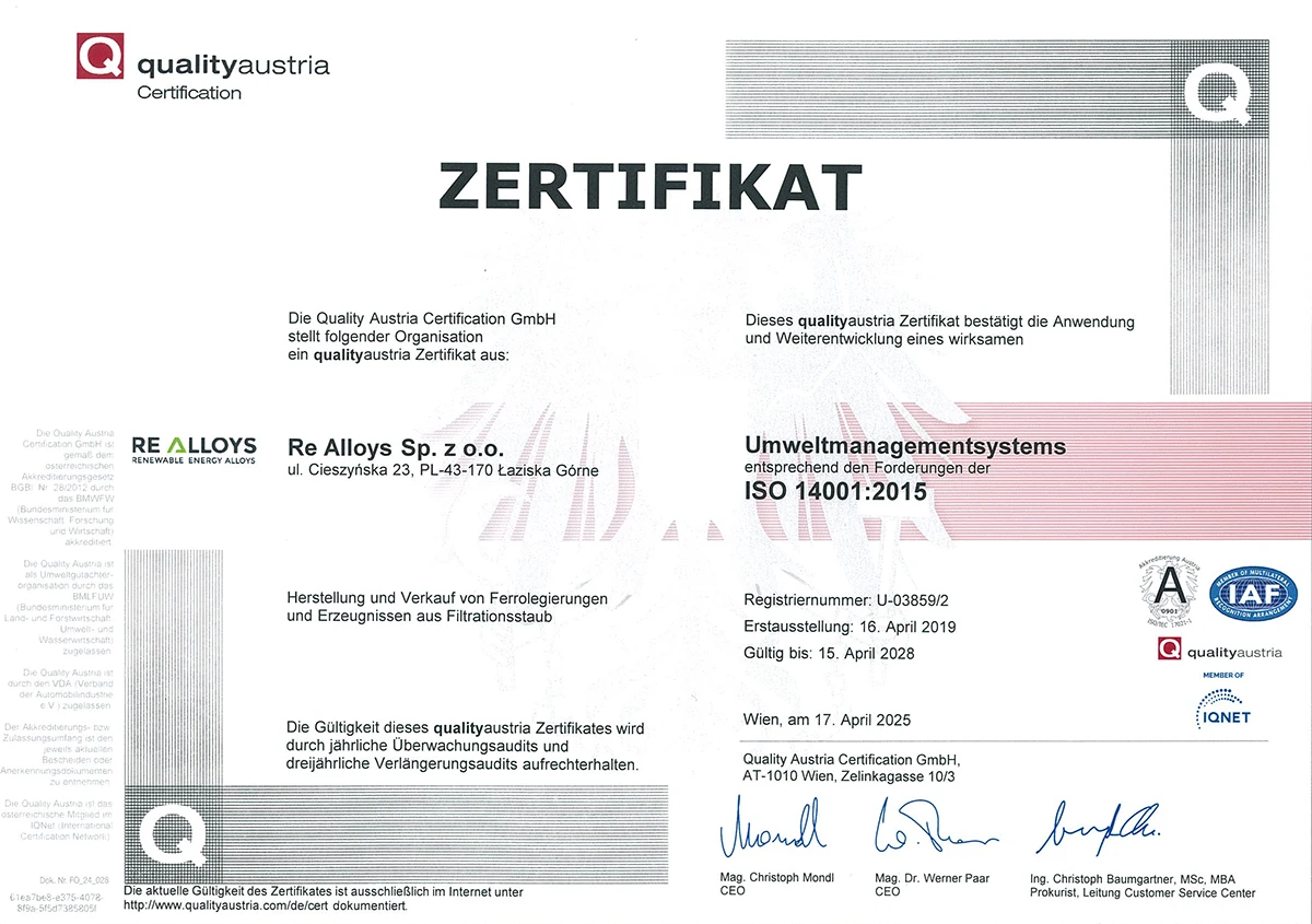 Considering the above, Re Alloys analyses environmental aspects and monitors influence on the environment. We declare that we observe the requirements imposed by law, environmental programmes and regulations; we also take measures in the field of environmental protection that go beyond the external requirements. We constantly improve and introduce solutions which minimise our negative impact on the environment.